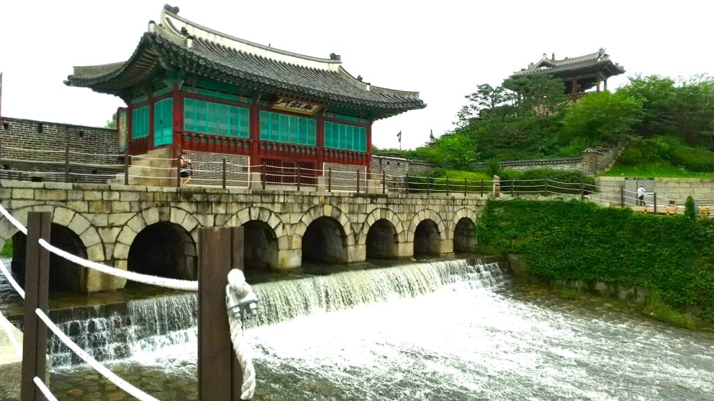 華城には水原川が北から南へと横切るように流れており、城郭と川が交わる場所には水門が設置されています。城郭北側には北水門、南側には南水門が設けられています。北水門を華虹門といい、7つの虹のような形をしたアーチ型の水門があります。この7つの水門の大きさはそれぞれ異なり、中央の水門は左右の水門に比べ広めに造られ、降雨時、川を流れる水量を効果的に調整する役割を果たしています。