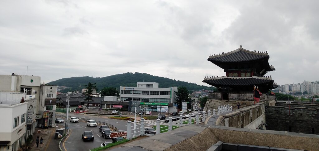 水原華城の城壁です。全長5.7kmの城郭の上の道を歩くと、所要時間は約2時間30分。城郭の外側には現代の水原市内が見え、内側には門や砲台、やぐら、軍の関係施設などがあり、閑静な雰囲気の街と共存しています。