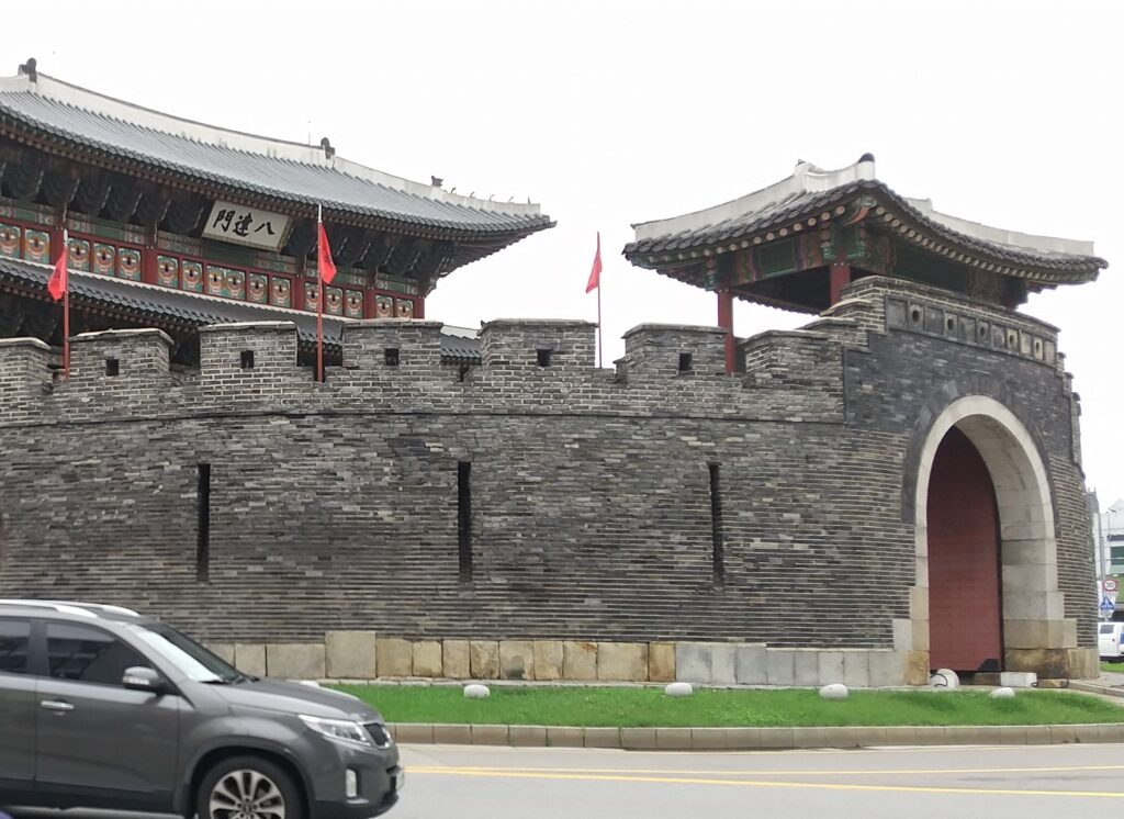 美術館から南に進んで華城の南門の八達門へ。門の前は甕城が丸く囲んでいます。