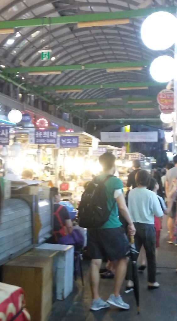 広蔵市場の最寄り駅は地下鉄1号線鍾路5街駅になります。東西に300mに広がる大きな市場で店舗と屋台で活気に満ちた市場です。どのお店も美味しそうな料理が並び、外国人観光客でいっぱいです。細巻の麻薬キンパや麺料理のカルグクス、韓国式ソーセージのスンデ、もちもちのクァベギ(ドーナツ)、ピンデトッ(緑豆チヂミ)等人気のお店がたくさん。