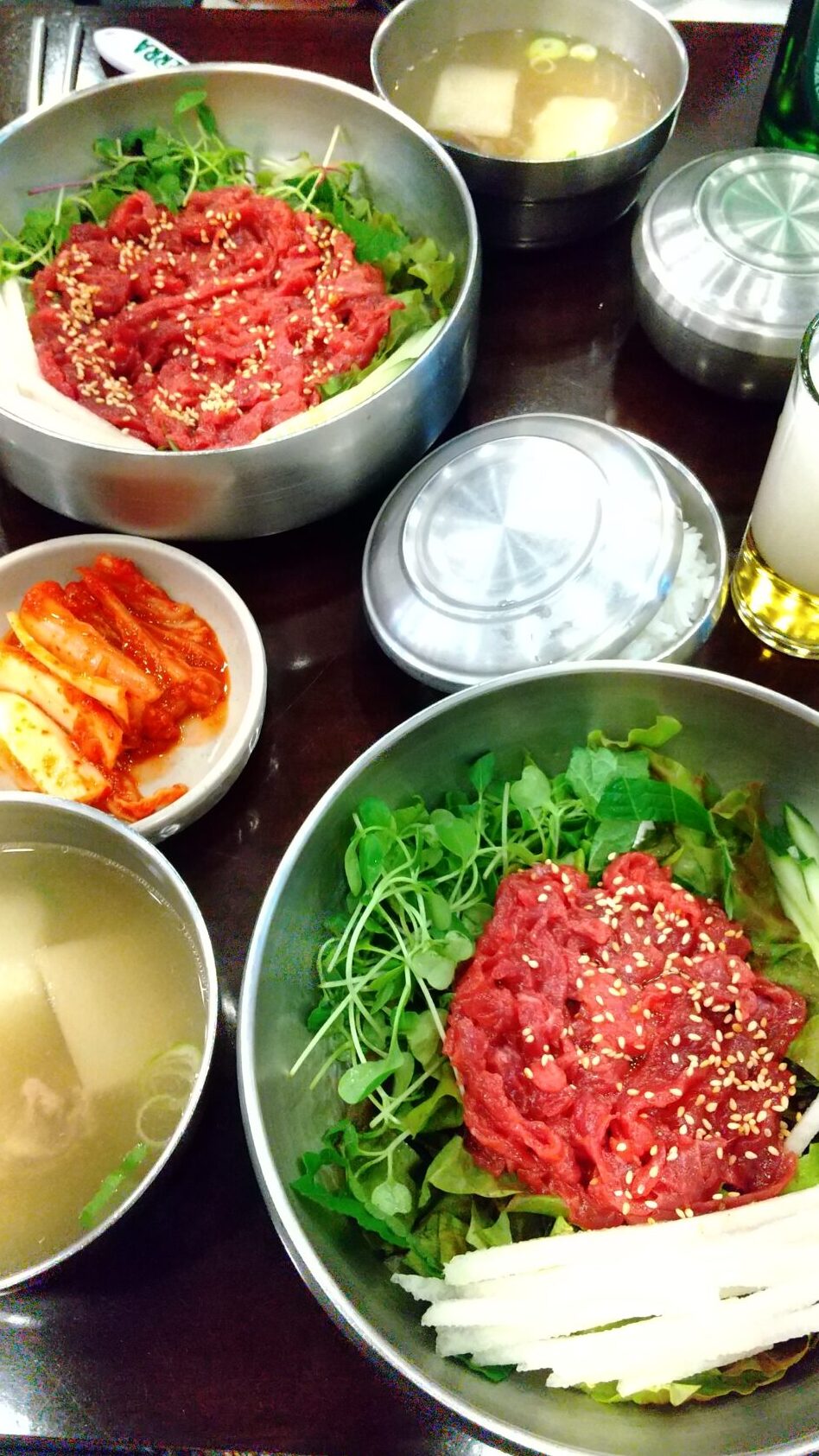 30分ほど並んで入店し、その時点で活ダコも売り切れてしまっていました。早くいくのをお勧めします。どうにかユッケビビンバとビールを注文して頂きます。7年連続ミシュラン納得の美味しさです。付け合わせの牛のスープも味わい深くてこのスープの虜になってしまいました。